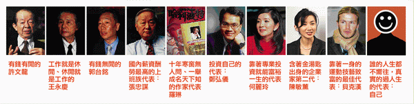 對於台灣經濟現象觀察深刻的國內企管大師元智大學教授許士軍認為,現在是講求個性化的時代,所以會有一定比例的人士只想做自己。不過,從第二名的許文龍來看,可以看出社會上對於事業成就與生活品質,要取得平衡的企求。 |